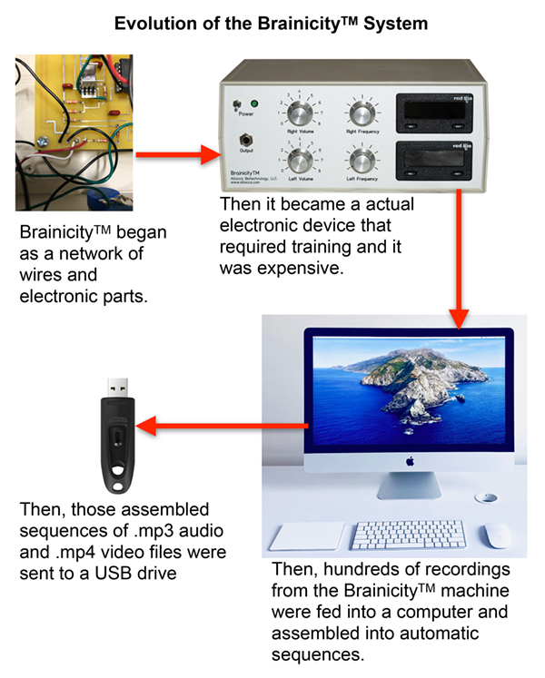 Unlock Your Brain's Potential. At Allocca Biotechnology, we believe that true health and wellness come from optimizing every aspect of your body and mind. That's why we're offering our BrainicityTM Brain Enhancement system, designed to enhance your cognitive function, memory, and creativity. Our approach to brain enhancement sets us apart from the competition, as we address not only the physical but also the emotional and mental aspects of brain health. Take advantage of this offer now and experience the benefits of a sharper, clearer mind. What is BrainicityTM BrainicityTM Brain Enhancement, a system that uses audio stimulation, has evolved into the BrainicityTM Brain Enhancement system, a system that uses a unique combination of audio and video stimulation. BrainicityTM generates a unique waveform with a specific number of harmonics. This special waveform at different frequencies are fed into the brain using audio and visual stimulation. The heart produces electromagnetic signals, which is called electrocardiography (ECG) or the heart biofield. The brain produces electromagnetic signals, which is called electroencephalography (EEG) or the brain biofield. The brain produces an erratic biofield that can be deciphered. Brain waves are classified by frequency as Delta, Theta, Alpha, and Beta waves. Delta (0.5 Hz to 4 Hz) is seen normally in slow wave sleep. Theta (4 Hz to 8 Hz) is seen in drowsiness, meditation, and creative states. Alpha (8 Hz to 12 Hz) emerges with closing of the eyes and with relaxation, and attenuates with eye opening or mental exertion. Beta (12 Hz to 30 Hz) is associated with active, busy or anxious thinking and active concentration. Gamma (30 Hz to 42 Hz) modulate perception and consciousness. A greater presence of gamma may relate to expanded consciousness. BrainicityTM uses integrated harmonic wave audio patterns to facilitate multiple brain biofield resonances. Too many harmonics can cause the brain to be overwhelmed because it has a limit of how much information can be processed at a given time resulting in the brain ignoring the inputs. Too little harmonics will not be effective. An integrated wave will produce a limited number of harmonics, which can be interpreted by the brain. Resonance occurs when the frequency of a periodic waveform is in phase with an external periodic waveform of equal or almost equal frequency to the internal frequency. This causes the system to oscillate with a larger amplitude than the force applied at other frequencies. Waveforms in the frequency range of 0.5 to 20 hertz are below the human hearing range. In order for the brain to be able to sense brain wave frequencies it cannot hear, binaural application of different frequencies are applied to the brain. The difference between two frequencies produces a third frequency, which is within the human hearing range of the brain wave frequencies (brain biofield). Then, the resulting complex pattern of waveforms are set to achieve multiple resonances with the brain's own waves. There are three types of BrainicityTM selections: BrainicityTM Resonance, BrainicityTM Binaural, and BrainicityTM Bilateral. Why so many? Because different people relate to different frequencies and patterns. BrainicityTM Resonance sends unique BrainicityTM pattern frequencies that resonates with the brain via speakers or earphones or headphones. BrainicityTM Resonance can be used with headphones, earphones, or speakers. BrainicityTM Binaural sends different unique BrainicityTM pattern frequencies to the left and right ears via headphones or earphones. The brain will produce a third sound. BrainicityTM Binaural can only be used with headphones or earphones. BrainicityTM Bilateral sends different unique BrainicityTM pattern frequencies back and forth to the left and right ears via headphones or earphones. The brain will react to these sounds. BrainicityTM Bilateral can only be used with headphones or earphones. In a clinical study, the BrainicityTM system , formally known as NeuroPath, caused an immediate increase in alpha brain waves and relaxation. Just sit back and relax. |