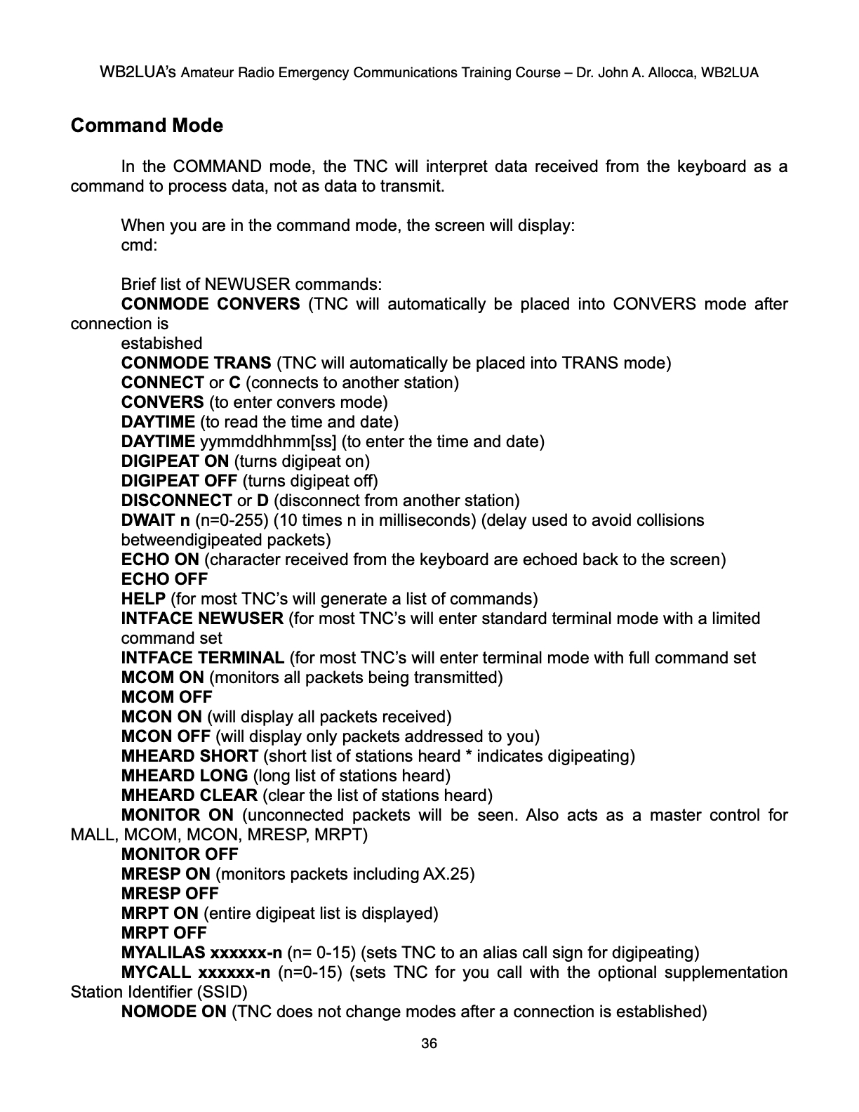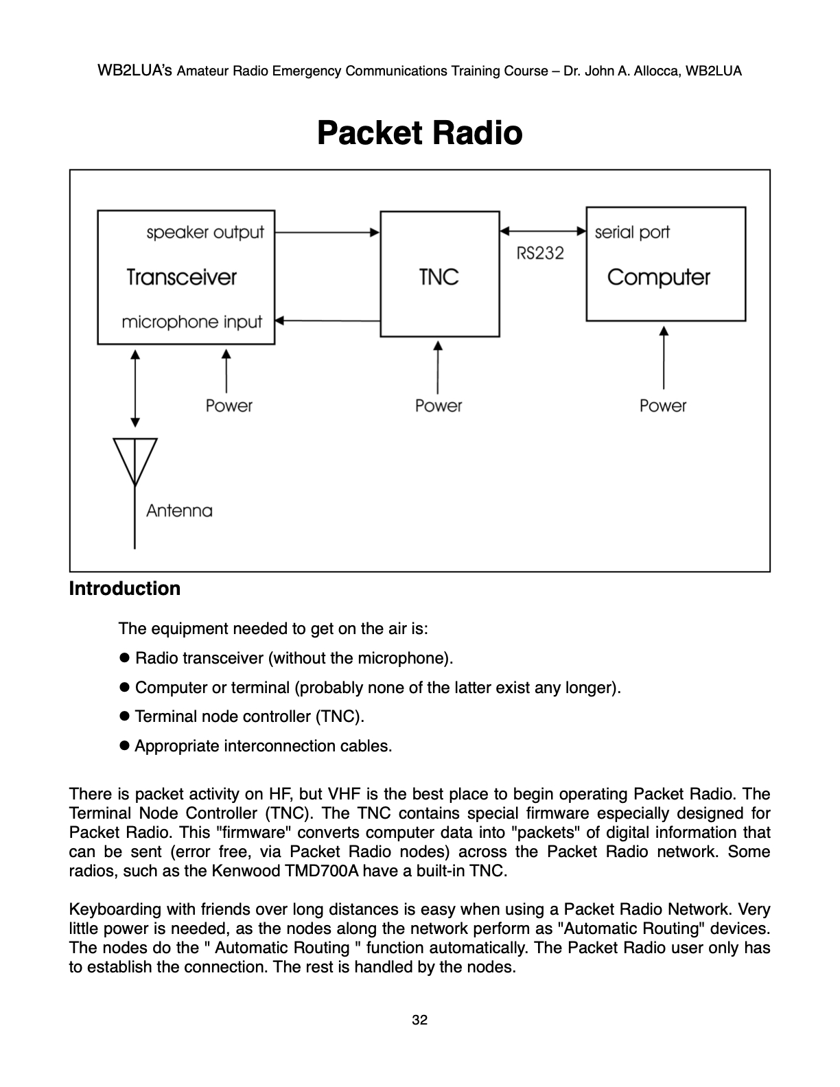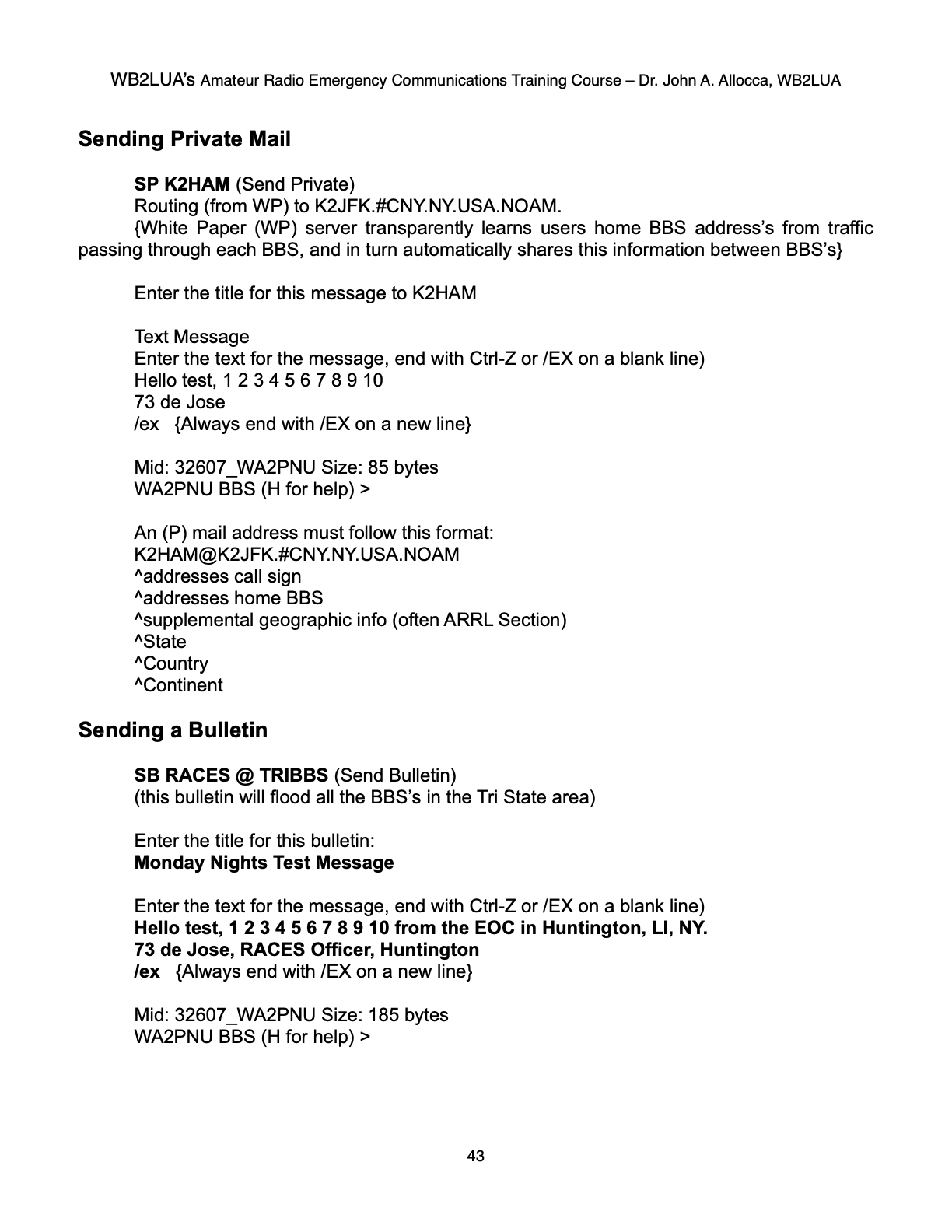 WB2LUA's Amateur Radio Emergency Communications Training Course Packet Radio Dr. John A. Allocca Allocca Biotechnology, LLC 202 East Main Street, Huntington, NY 11743 (631) 757-3919 drallocca@icloud.com www.allocca.com Copyright 2025 - All Rights Reserved SCROLL DOWN TO VIEW NEXT SLIDE Please Do Not Copy Click Here to Return to Main Menu |