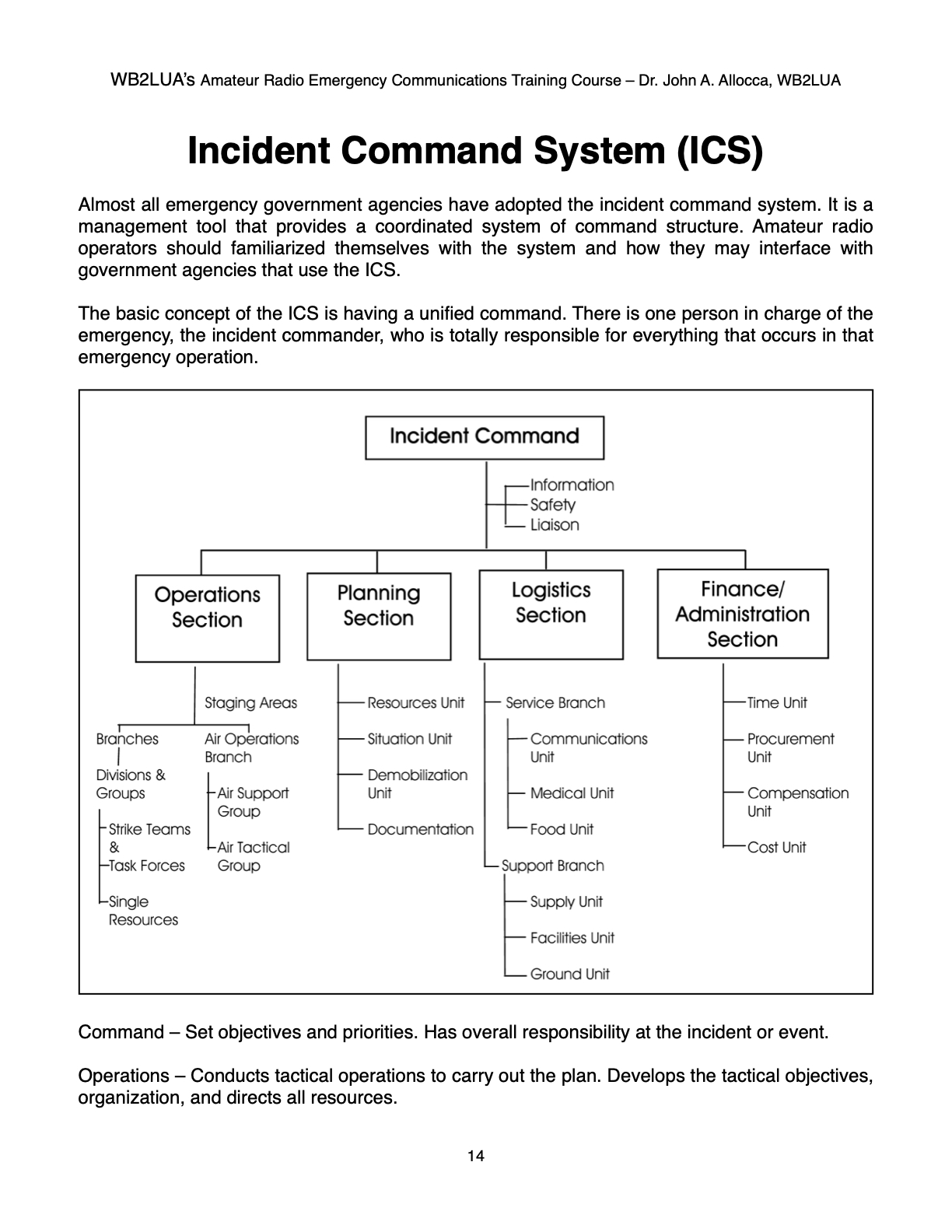 WB2LUA's Amateur Radio Emergency Communications Training Course Incident Command System (ICS) Dr. John A. Allocca Allocca Biotechnology, LLC 202 East Main Street, Huntington, NY 11743 (631) 757-3919 drallocca@icloud.com www.allocca.com Copyright 2025 - All Rights Reserved SCROLL DOWN TO VIEW NEXT SLIDE Please Do Not Copy Click Here to Return to Main Menu |