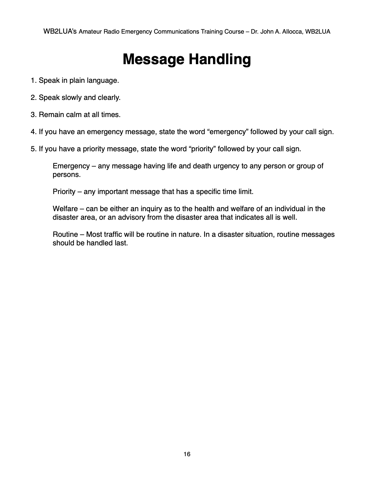 WB2LUA's Amateur Radio Emergency Communications Training Course Message Handling Dr. John A. Allocca Allocca Biotechnology, LLC 202 East Main Street, Huntington, NY 11743 (631) 757-3919 drallocca@icloud.com www.allocca.com Copyright 2025 - All Rights Reserved SCROLL DOWN TO VIEW NEXT SLIDE Please Do Not Copy Click Here to Return to Main Menu |
